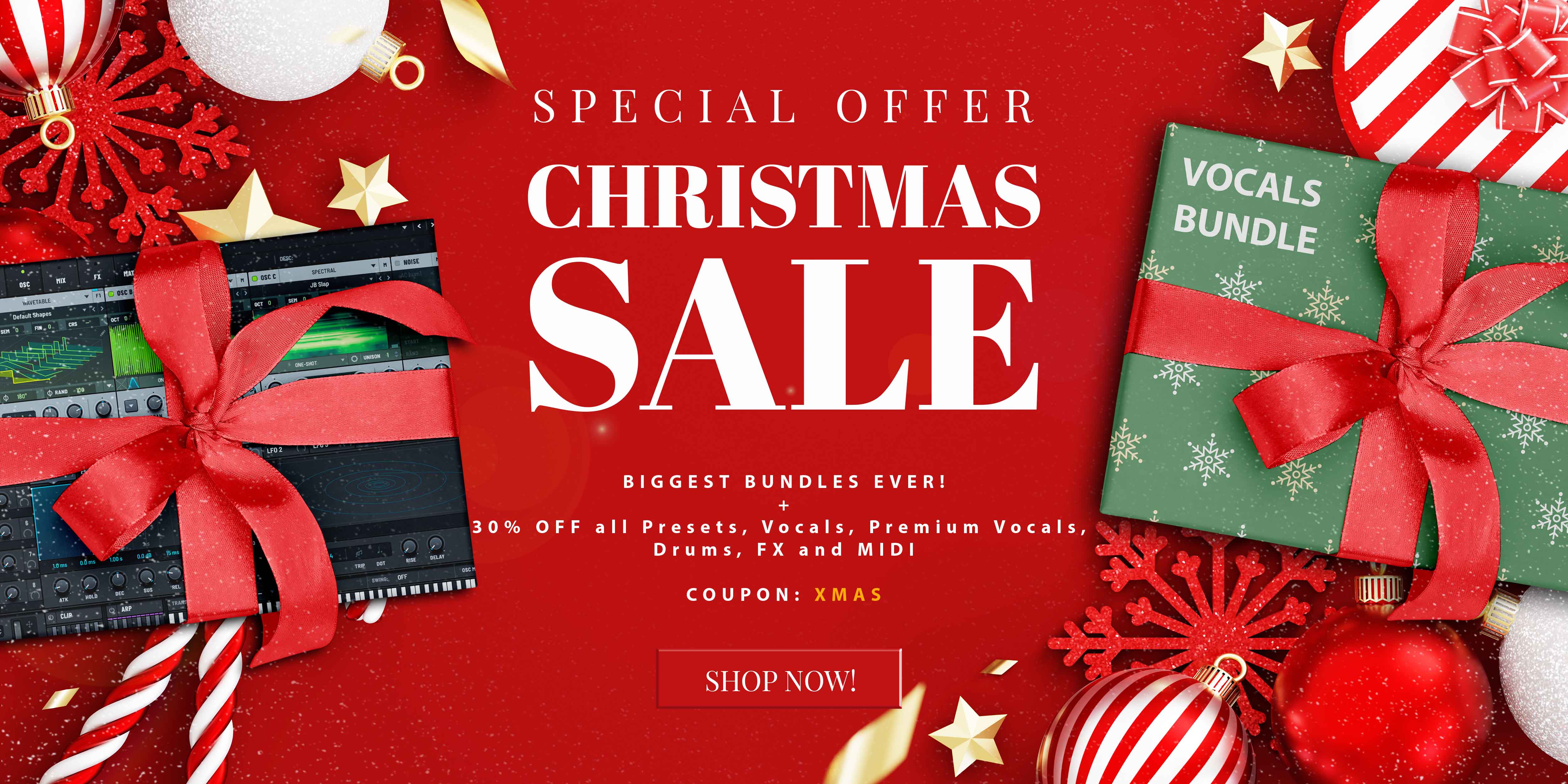 Enjoy the happy time and even brighter savings! Use code XMAS at checkout (2Checkout cart) and get 30% off everything – from Presets, Vocals, Samples to Vocals+, Premium Vocals, and even subscriptions! Thanks for being a part of the Vandalism family – we appreciate you!